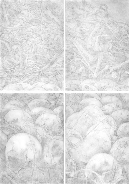 NACHT UND NEBEL – Museum der Schatten [Alain Resnais, Majdanek 1944], Kohle/Papier, 4-teilig, je 100 x 70 cm, gesamt 202 x142 cm